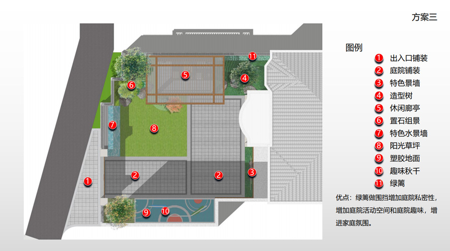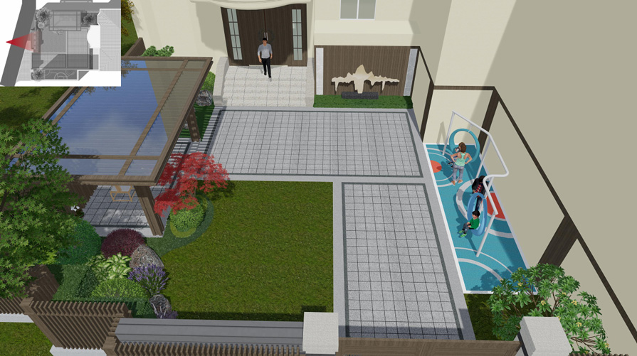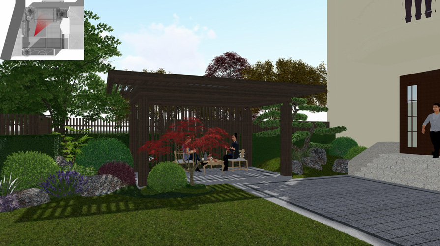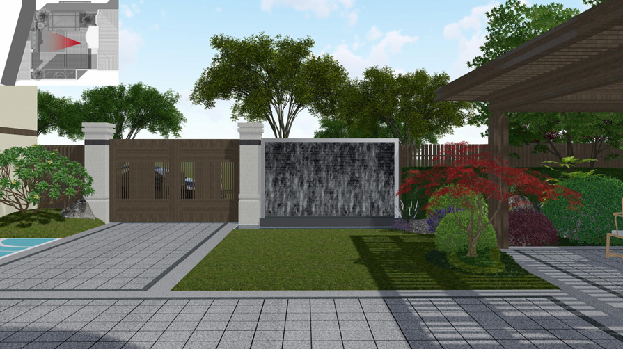 信陽別墅庭院由袁瑩瑩設計,客戶要求花園要有休息的涼亭,庭院的空間要相對封閉,有一個屬于自己的獨處環境。