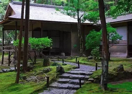 茶庭也叫露地是源自茶道文化的一種園林形式,至今茶庭的景觀作用己大于實(shí)用功能。茶庭式園林一般是在進(jìn)入茶室的一段空間里,按一定路線布置景觀,以拙樸的步石象征崎嶇的山間石徑,以地上的矮松寓指茂盛的森林,以蹲踞式的洗手缽聯(lián)想到清冽的山泉,以滄桑厚重的石燈籠來營(yíng)造和、寂、清、幽的茶道氛圍。有很強(qiáng)的禪宗意境。
