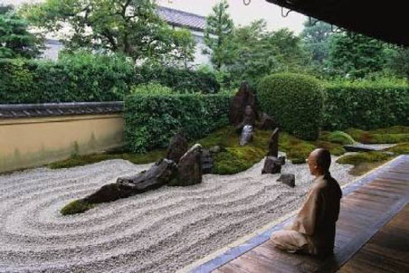 枯山水是日本庭園的精華,實(shí)質(zhì)是以砂代水,以石代島的做法。用極少的構(gòu)成要素達(dá)到極大的意韻效果,追求禪意的枯寂美。枯山水有兩種寓意對(duì)象,一是山澗的激流或瀑布,日本稱之為枯瀧;另一種是海岸和島嶼;池泉是微縮的真山水,池泉一般是園景的中心,枯山水與池泉都是在自然布局的水池中設(shè)溪坑石代表島嶼,與岸相連的駁岸稱中島按不同位置分別稱為龜島、鶴島、等名,立在水中或砂中的巖石有更多名稱,在此不再贅述。